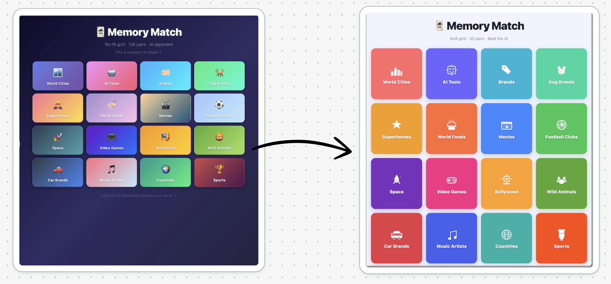 Started with a simple prompt describing the game and the AI opponent. The initial output handled the core logic well but lacked engaging visuals. Iterated by adding more contextual prompts around visual direction — specifically asking for bold, engaging colors and a more playful interface to make the experience feel enjoyable and repeatable. Here are 2 screenshots of before and after visual direction .
